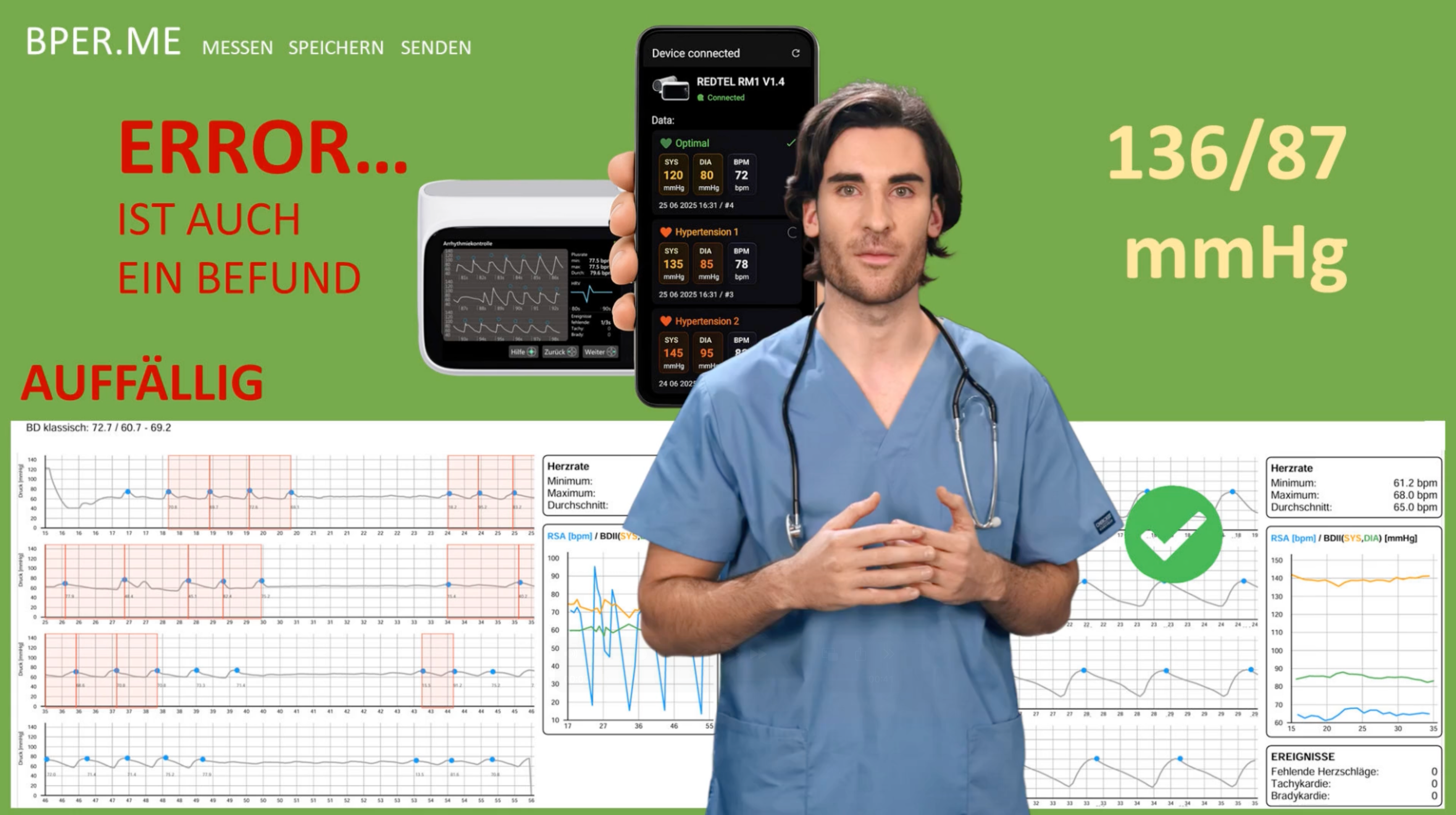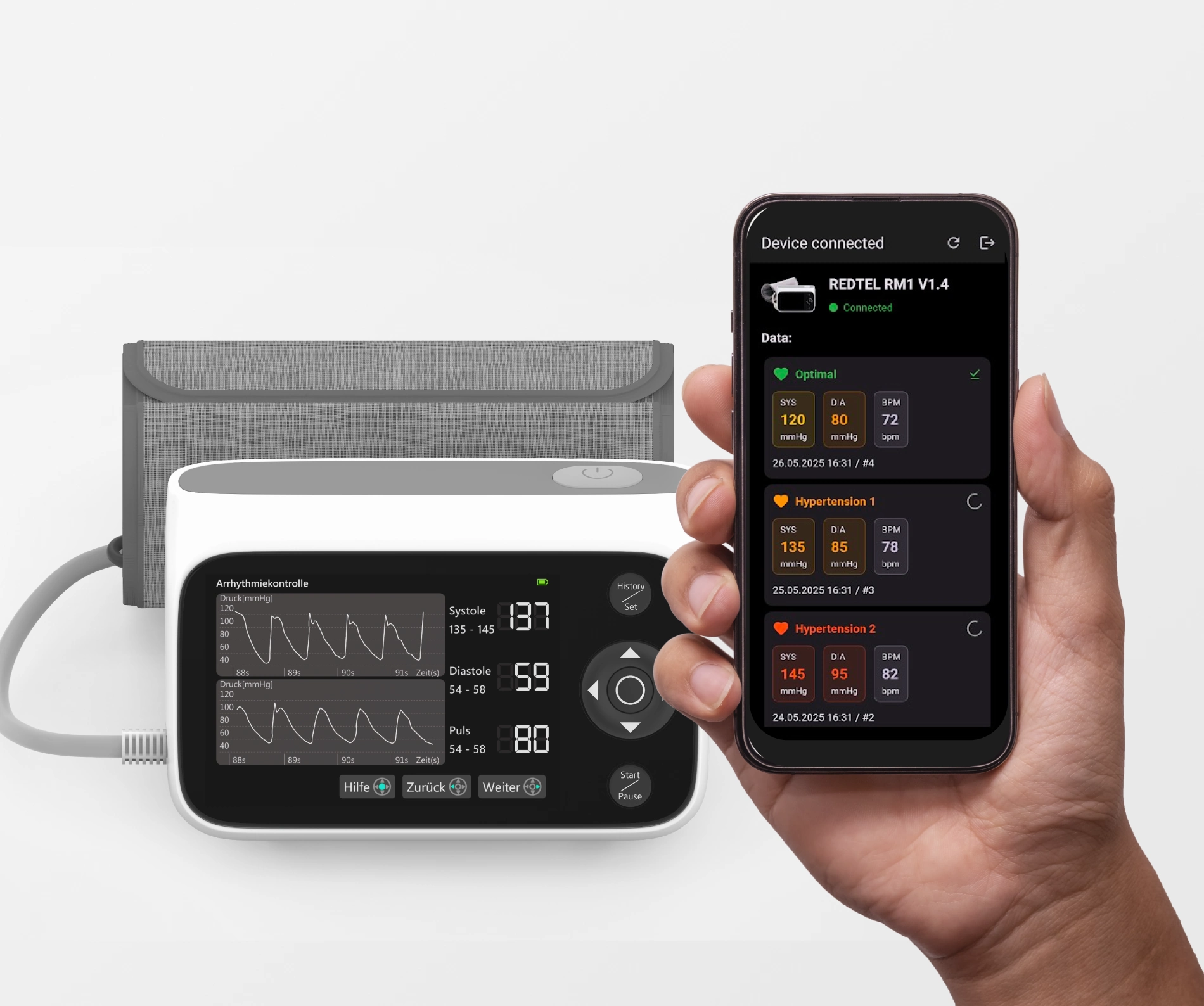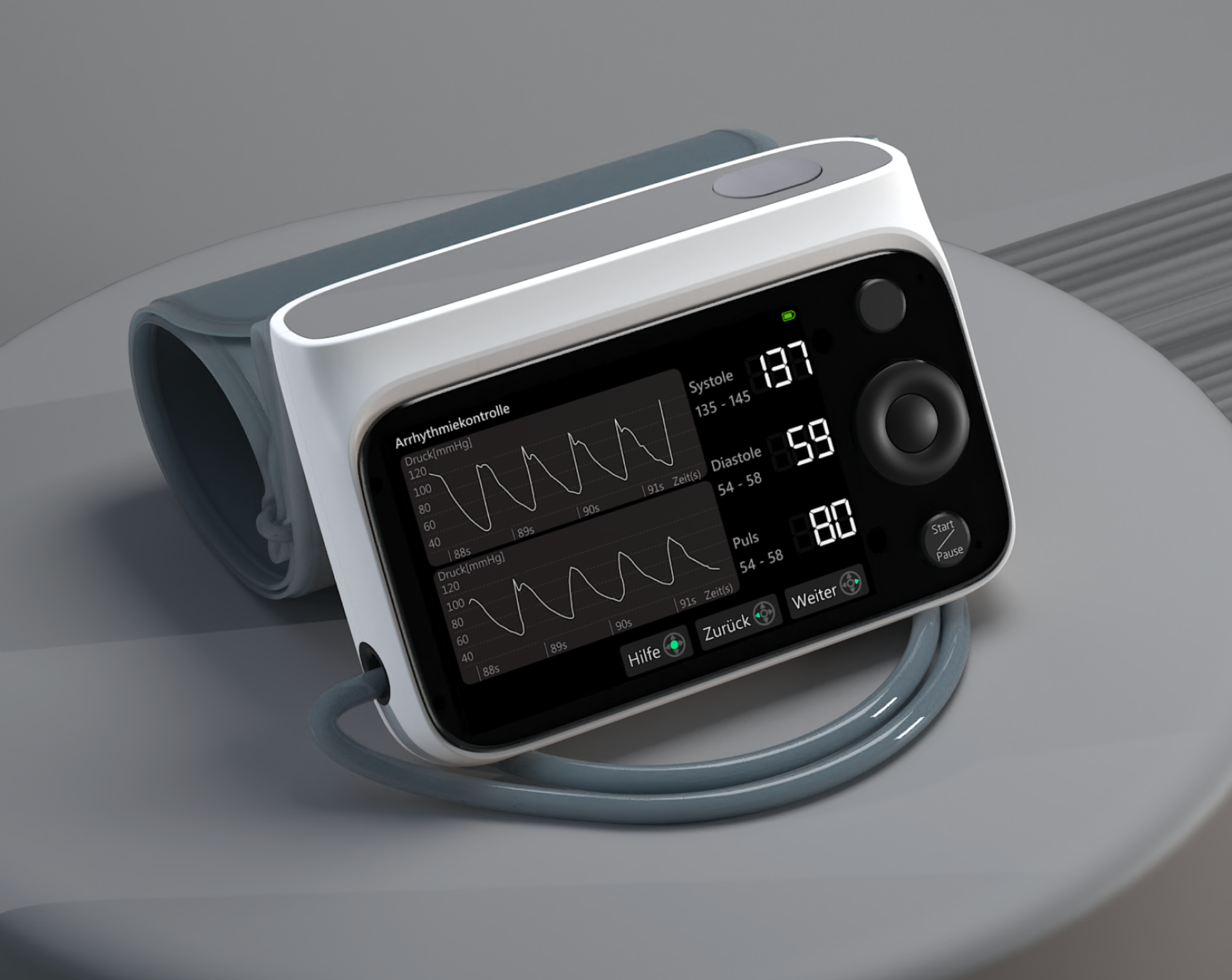 | Oberarm-Manschette | Zwei Zahlen genügen. | Arrhythmie = ERROR • keine Kurve, kein Kontext. |